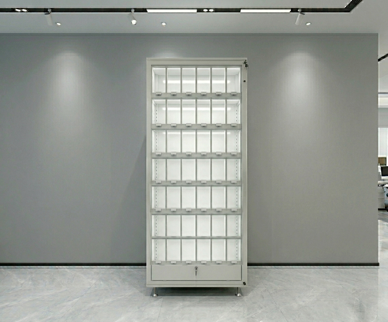 藍燈閃爍提示取貨|36格存貨格|格口尺寸 185 *125 *250|採用高強度鍍鋅鋼板外殼,搭配防紫外線 (UV) 噴塗,經久耐用。